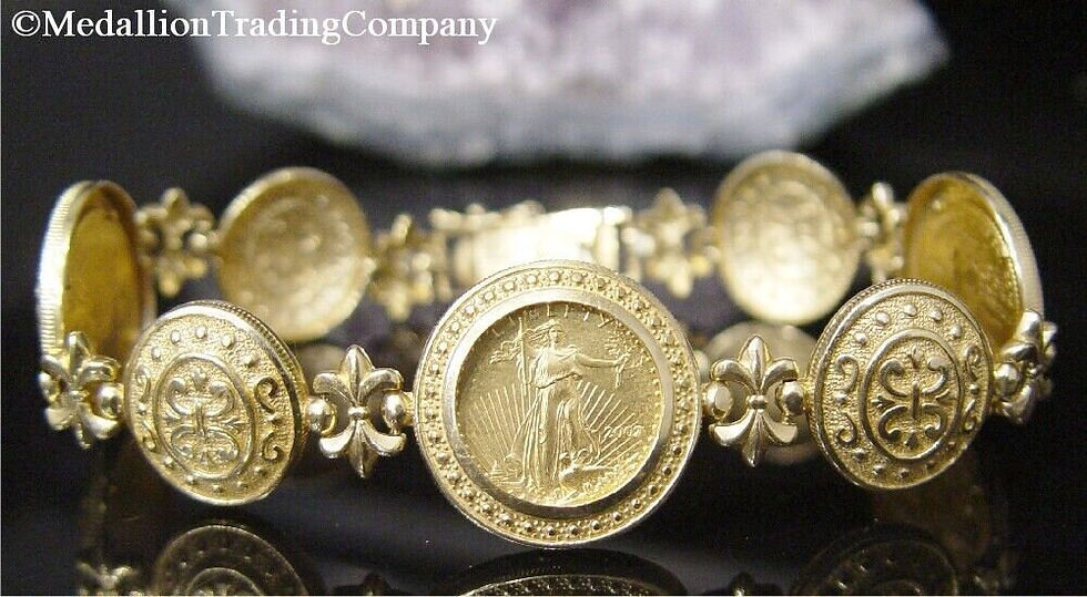 14k 22k Gold 2007 Liberty American Eagle 5 Coin Etruscan Fleur di Lis Bracelet