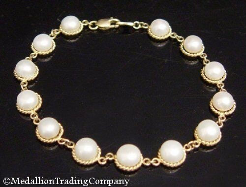 14k yellow gold 6mm white button pearl rope edge link tennis bracelet 7.5 inch